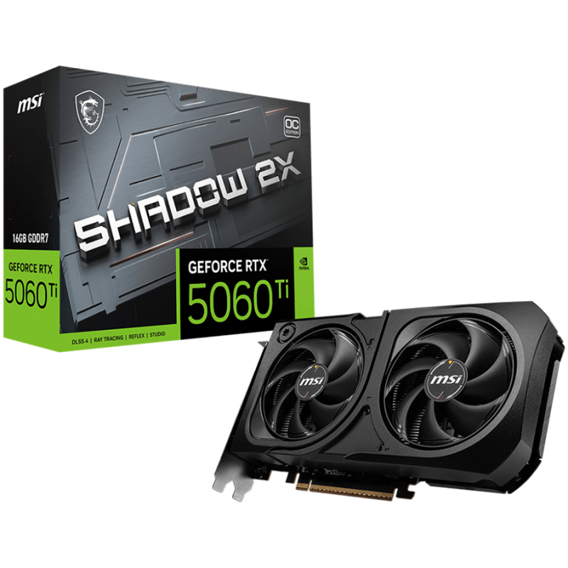 MSI Video Card NVIDIA GeForce RTX 5060 Ti 16G SHADOW 2X OC PLUS, 16GB GDDR7, 128-bit, 2602 MHz Boost, 4608 CUDA Cores, PCIe 5.0 (x8), 3x DP 2.1b, HDMI 2.1b, RAY TRACING, Dual Fan, 180W TDP, 8-pin PCIe Power, G-SYNC, 2-Slot, 3Y