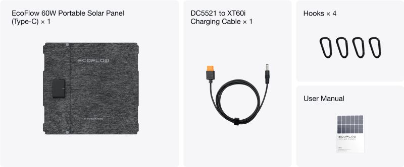 ДРУГИ | INCLUDED: EcoFlow 60W Portable Solar Panel (Type-C) ; 1DC5521 to XT60i Charging Cable ; Hooks x 4 ; User Manual |