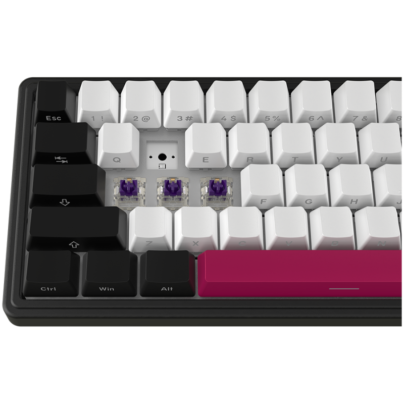 Двуслойни PBT капачки с обозначения отстрани за лесно виждане на вторичните функции. Включени са 6 акцентни клавиша в контрастни цветове (стрелки, Enter и Space), за индивидуален стил. Изчистен външен вид без компромис с функционалността.